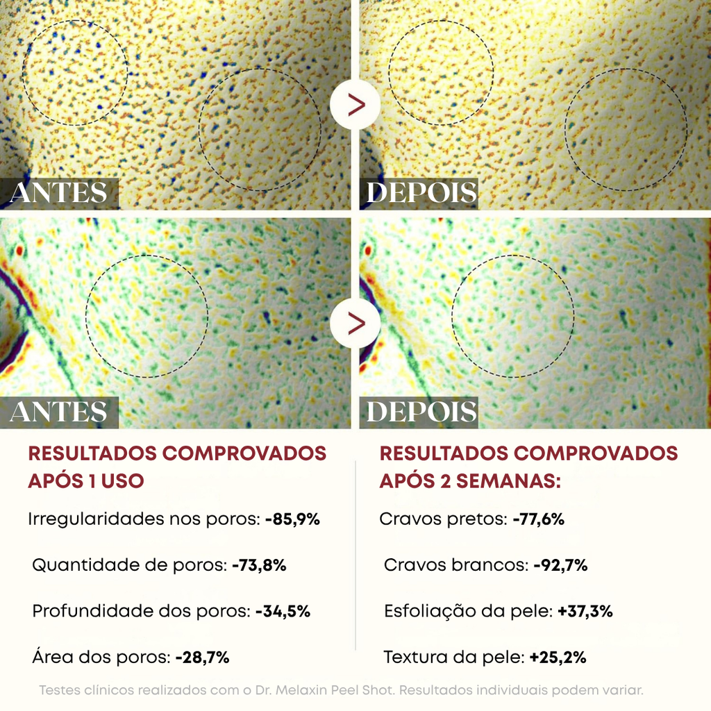 O Dr. Melaxin™ Peel Shot remove impurezas, cravos e células mortas sem irritar a pele, revelando um toque macio, uniforme e luminoso desde o primeiro uso.